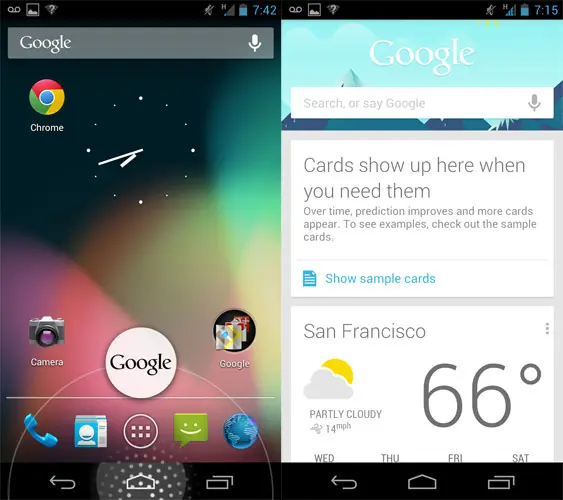 Google Now & Трекинг активности Из интересного также стоит отметить, что поиск стал более персонализированным и просто удобным. Теперь при попытке узнать погоду, нам будет выдана красивая карточка со всей необходимой информацией. При поиске ресторана, нам сразу покажут карточку с досье, где будет не только название и адрес, но и имя шеф-повара, указано фирменное блюдо и даны отзывы посетителей заведения. Впрочем, если этой информации окажется недостаточно, то жестом можно будет запросто отпарвить карточку куда-нибудь подальше и получить стандартную поисковую выдачу Google.