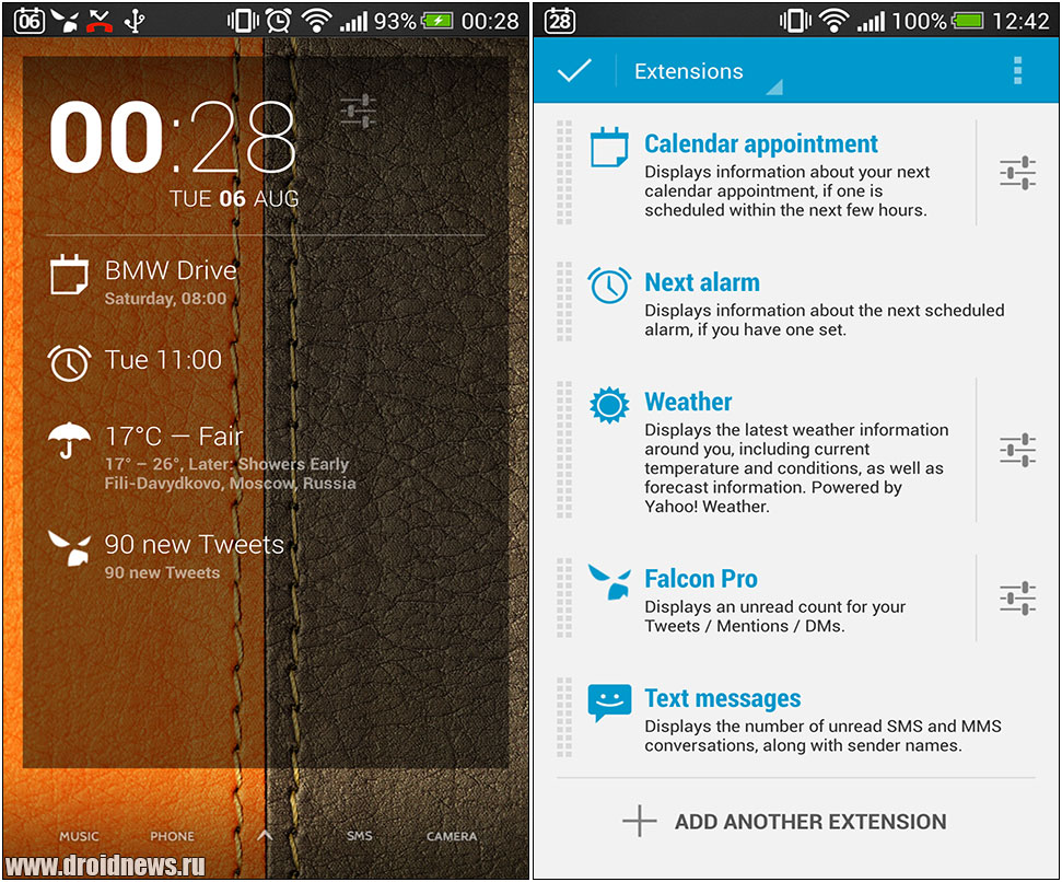 В целом, DashClock Widget очень легок в настройке. Если вести речь о состоянии «установил и забыл», то приложение содержит набор модулей для отображения информации о будильниках, погоде, а также отметках в вашем календаре. Сюда же можно добавить индикатор пропущенных вызовов, сообщений и электронных писем. Но и это еще не все, ведь поддержка расширений реально действует. К примеру, можно подключить твиттер-клиент Falcon Pro – все, что необходимо установка дополнений и парочка галочек в настройках.