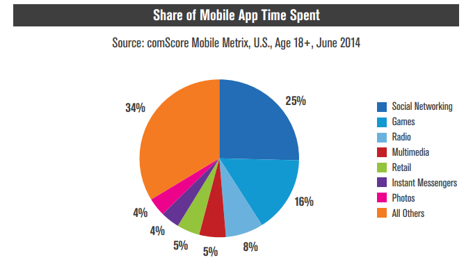 Самыми востребованными приложениями оказываются те, что из категории социальных сетей. Затем идут игры и радио, получая 16% и 8% соответственно. Затем приложения для обмена мгновенными сообщениями и работы с фото, обе категории получили 4%.