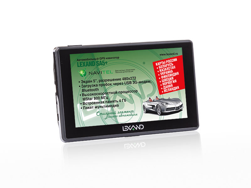 • Все модели серии SA5 могут выходить в Интернет для браузинга, загрузки данных о пробках и работы со встроенными в навигационные программы онлайновыми сервисами с помощью внешнего 3G-модема, подключенного через USB-хост. Сегодня это особенно актуально, учитывая, что различные возможности, связанные с Интернетом, есть в абсолютном большинстве навигационных пакетов. Lexand SA5 – первые в России классические навигаторы на операционной системе Windows CE, официально поддерживающие работу с внешними 3G-модемами. Драйверы, необходимые для работы модемов-«свистков», созданы специально для новинок Lexand – в конкурирующих устройствах такой опции нет. • Процессор MStar с частотой 800 МГц – против 600 МГц у классических GPS-навигаторов предыдущего поколения. В итоге новинки серии SA5 работают минимум на 25% быстрее. • Более того, Lexand SA5+ и SA5 HD+ могут выходить в Сеть еще и с помощью телефона/смартфона, подключенного по интерфейсу Bluetooth и выступающего в качестве беспроводного модема. • Расширенная картография от «Навитела». Все предыдущие навигаторы Lexand шли только с картами России, а новинки комплектуются картами России, Украины, Беларуси, Казахстана, Финляндии, Швеции, Норвегии, Дании и Исландии с пожизненным обновлением.