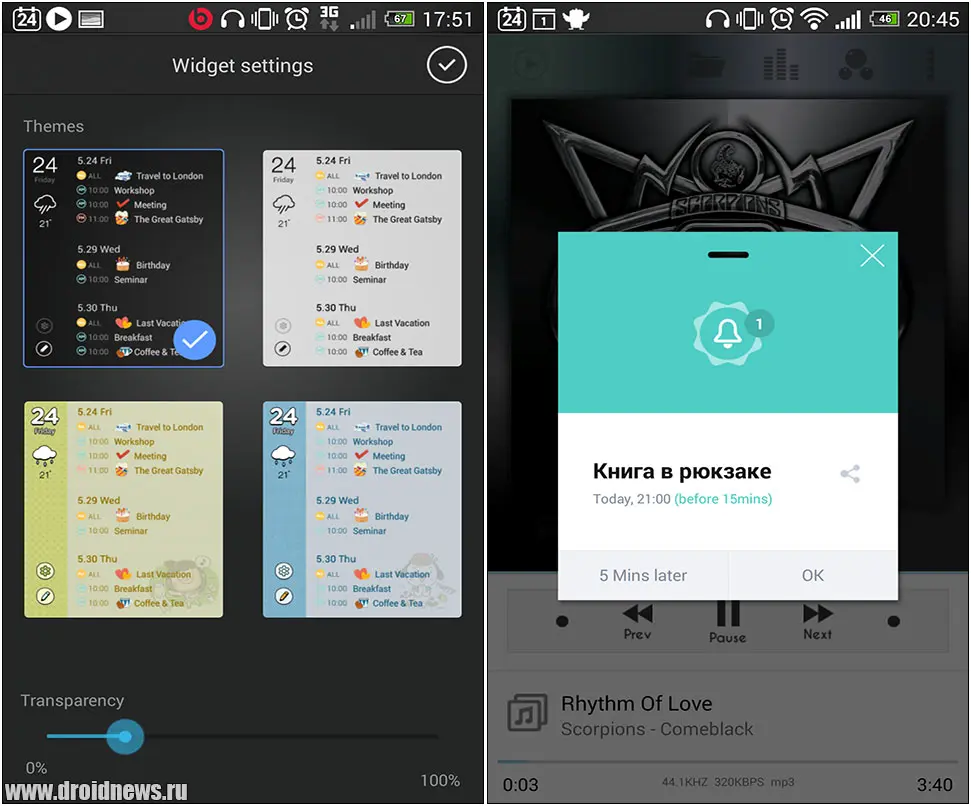 Собственно интерфейс Sol Calendar выглядит вполне лаконично, все читабельно, а поддержка жестов и скоростное переключение представлений делает работу с приложением простым и комфортным. Что касается количества виджетов, то тут целая гора всевозможных форм и размеров. На рабочий стол можно закрепить, как текущее задание на повестке дня, так и записи на будущую неделю. Кстати размеров тут много, очень много, начиная от стандартного 2х2 и заканчивая 6х6 – так что лопатоподобные девайсы и Android-планшеты можно украшать до неузнаваемости.