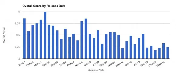 На таблице размещенной выше видно, какие из смартфонов попали в самое начало таблицы и наименее безвредны для экологии, а какие представляют опасность для окружающей среды. Диаграм ниже показывает количество содержания вредных веществ в баллах-оценках в зависимости от времени выпуска гаджета.