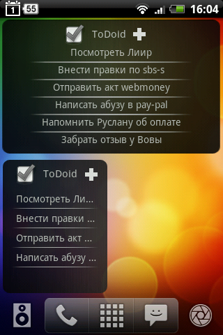 Что же касается виджета, то он опять-таки не просто выводит добавленные ранее задания, но и дает возможность быстро добавить что-то новое не загружая программу. Для этого нужно тапнуть по значку "+" в правом верхнем углу. Тап по самому виджету приводит к загрузке приложения. Виджеты имеются трех размеров, но на скриншот все не влезли.